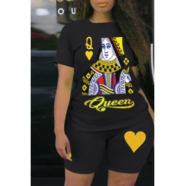 Lovely Street O Neck Print Black Plus Size Two-piece Shorts Set