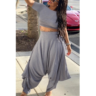 Lovely Casual Fold Design Asymmetrical Grey Two-piece Pants Set
