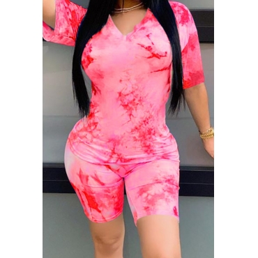 Lovely Trendy V Neck Tie-dye Rose Red Two-piece Shorts Set