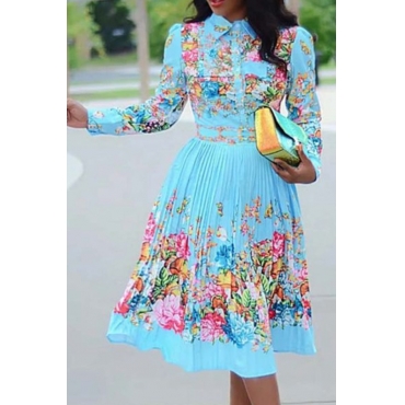 Lovely Stylish Plants Print Baby Blue Knee Length Dress