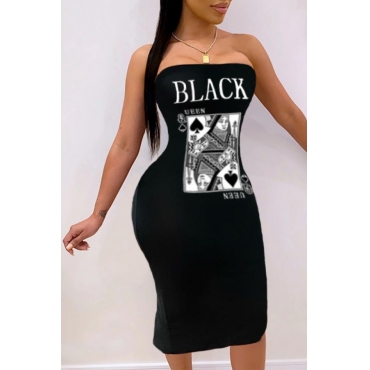 Lovely Trendy Dew Shoulder Print Black Knee Length Dress