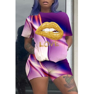 Lovely Street Lip Print Purple Two-piece Shorts Set