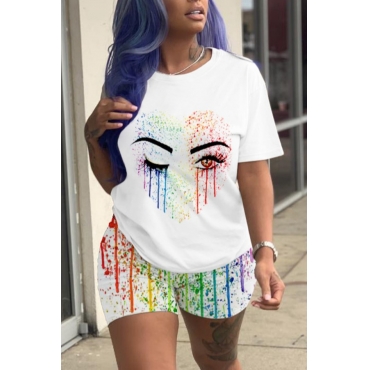Lovely Street O Neck Print White Two-piece Shorts Set