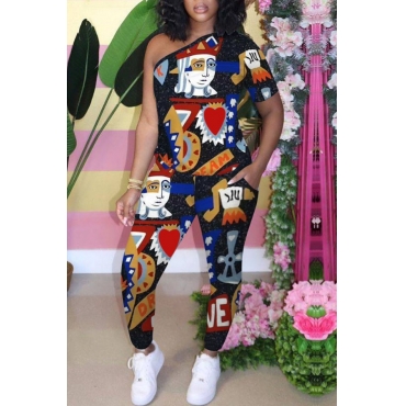 lovely Street One Shoulder Print Black Two-piece Pants Set