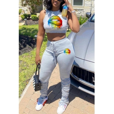 Lovely Leisure Lip Print Grey Two-piece Pants Set