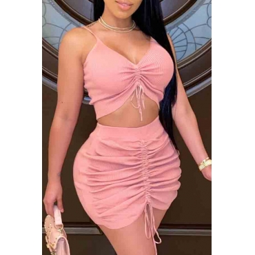 Lovely Sexy Fold Design Pink Two-piece Skirt Set
