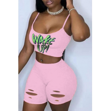 Lovely Sportswear Letter Print Pink Two-piece Shorts Set