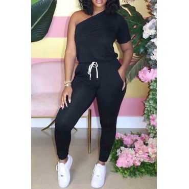 Lovely Casual One Shoulder Lace-up Black Two-piece Pants Set