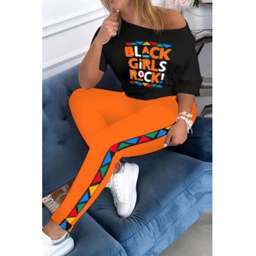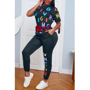 Lovely Street O Neck Letter Print Black Two-piece Pants Set