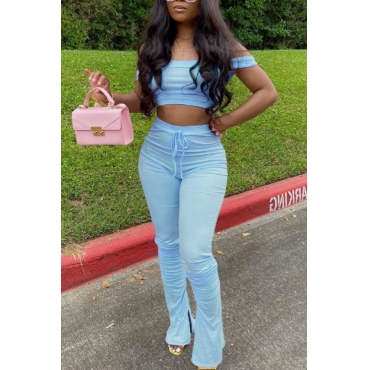 Lovely Casual Dew Shoulder Baby Blue Two-piece Pants Set