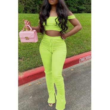 Lovely Casual Dew Shoulder Green Two-piece Pants Set