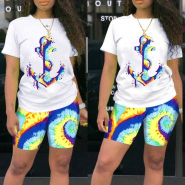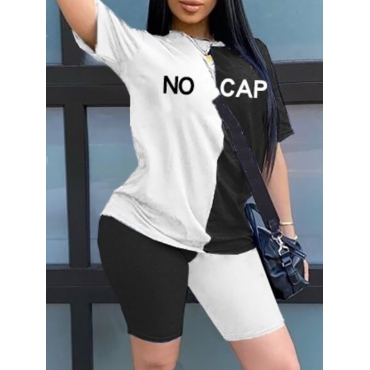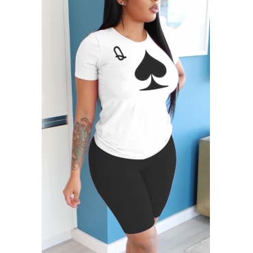 Lovely Casual O Neck Print Patchwork White Two-piece Shorts Set