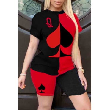 Lovely Casual O Neck Print Patchwork Red Two-piece Shorts Set