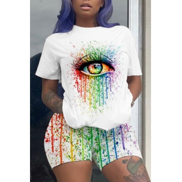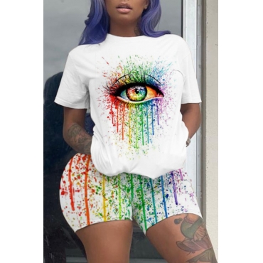 Lovely Leisure O Neck Eye Print White Two-piece Shorts Set