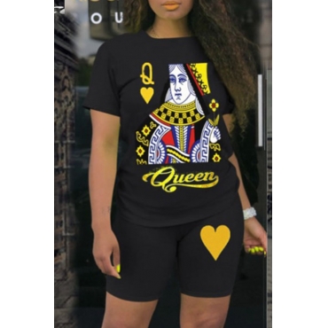 Lovely Casual O Neck Print Black Two-piece Shorts Set