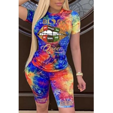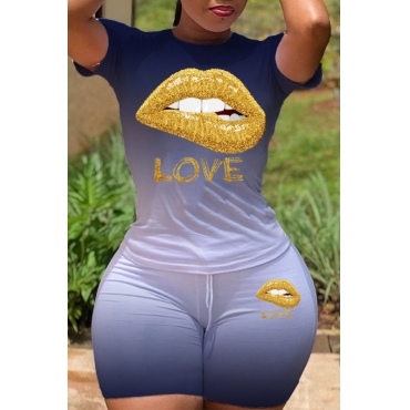 Lovely Casual O Neck Lip Print Blue Two-piece Shorts Set
