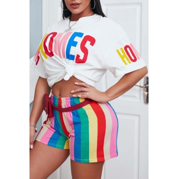Lovely Casual O Neck Rainbow Striped White Two-piece Shorts Set