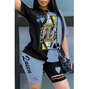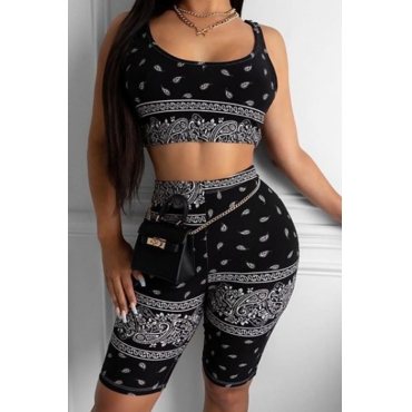 Lovely Casual Print Patchwork Carbon Black Two-piece Shorts Set
