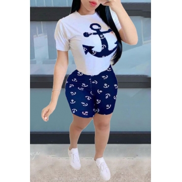 Lovely Casual O Neck Print Blue Two-piece Shorts Set