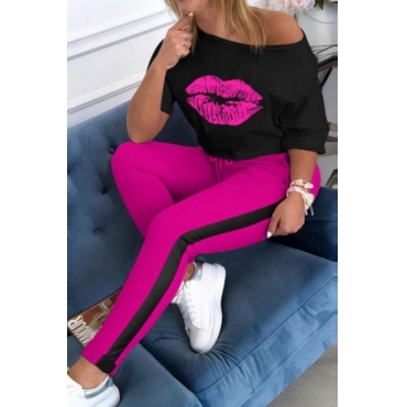 Lovely Casual Lip Print Purple Two Piece Pants Set