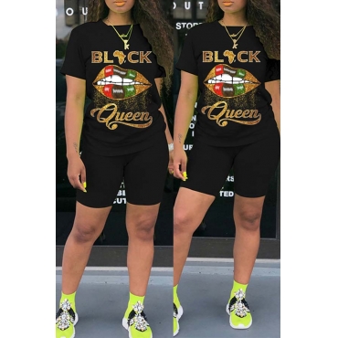 Lovely Casual Lip Print Black Two-piece Shorts Set