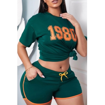 Lovely Sportswear O Neck Letter Print Green Plus Size Two-piece Shorts Set