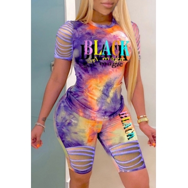 Lovely Casual Tie-dye Hollow-out Purple Two-piece Shorts Set