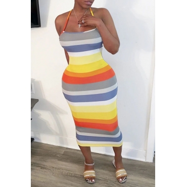 Lovely Sexy Rainbow Striped Orange Mid Calf Dress
