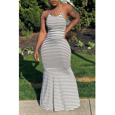 Lovely Sexy Striped Print Backless Black-white Maxi Dress