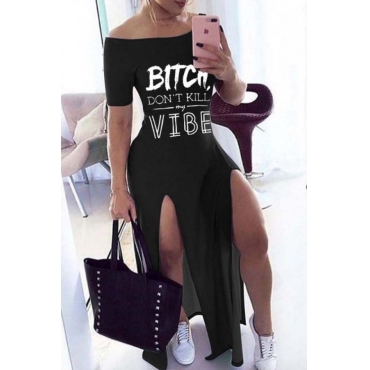 Lovely Casual Off The Shoulder Letter Print Black Ankle Length Dress