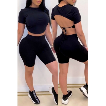 Lovely Sexy Backless Black Two-piece Shorts Set