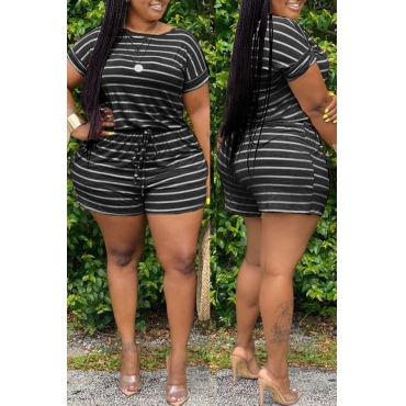 Lovely Casual Striped Black Plus Size Two-piece Shorts Set(Batch Print)