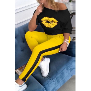 Lovely Casual Lip Print Yellow Two-piece Pants Set