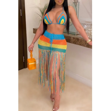 Lovely Casual U Neck Rainbow Print Multicolor Two-piece Shorts Set