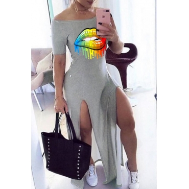 Lovely Casual Lip Print Grey Maxi Dress