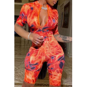 Lovely Casual O Neck Print Orange Two-piece Shorts Set