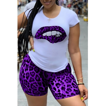 Lovely Casual Print Purple Two-piece Shorts Set