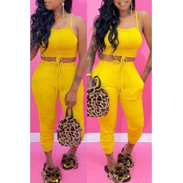Lovely Sexy Lace-up Yellow Two-piece Pants Set