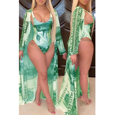 Lovely Print Green One-piece Swimsuit(With Cover-up)