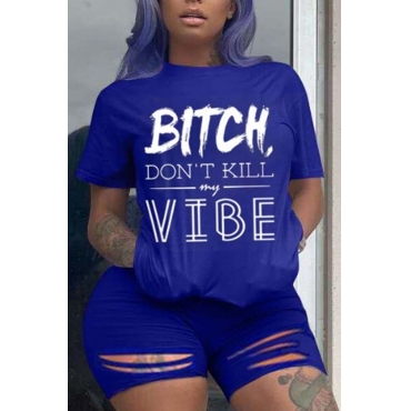Lovely Leisure O Neck Letter Blue Plus Size Two-piece Shorts Set
