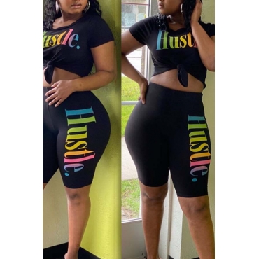 Lovely Leisure O Neck Letter Print Black Two-piece Shorts Set