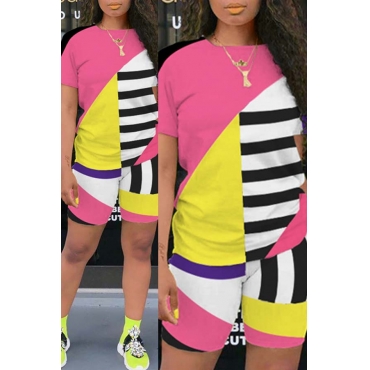 Lovely Leisure Color-lump Patchwork Pink Two-piece Shorts Set