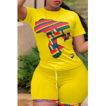 Lovely Casual O Neck Print Yellow Two-piece Shorts Set