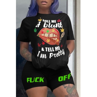Lovely Casual Lip Print Black Two-piece Shorts Set