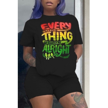 Lovely Casual O Neck Print Black Plus Size Two-piece Shorts Set