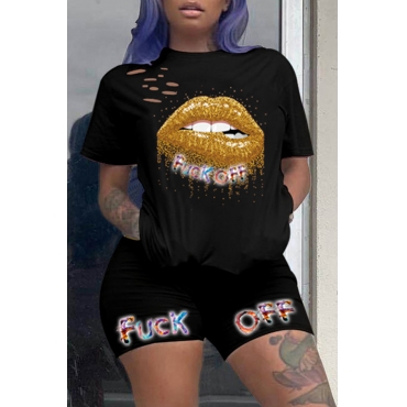 Lovely Leisure Lip Print Black Two-piece Shorts Set