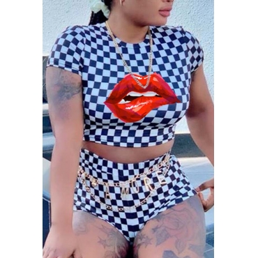 Lovely Stylish O Neck Lip Print Black And White Two-piece Shorts Set