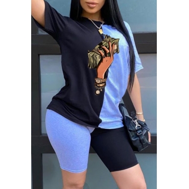 Lovely Casual O Neck Print Black Two-piece Shorts Set