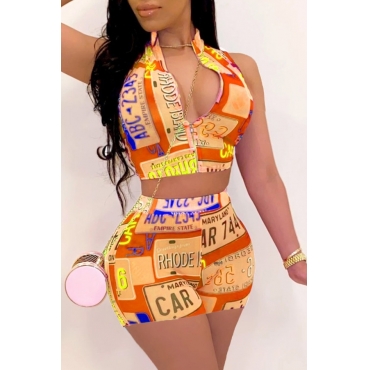 Lovely Sexy Letter Print Orange Two-piece Shorts Set