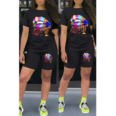 Lovely Casual Lip Print Black Two-piece Shorts Set